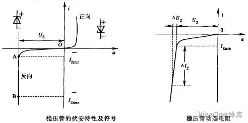 穩(wěn)壓管也是一種晶體二極管,它是利用PN結(jié)的擊穿區(qū)具有穩(wěn)定電壓的特性來工作的。穩(wěn)壓管在穩(wěn)壓設(shè)備和一些電子電路中獲得廣泛的應(yīng)用。我們把這種類型的二極管稱為穩(wěn)壓管,以區(qū)別用在整流、檢波和其他單向?qū)щ妶龊系亩O管。如圖畫出了穩(wěn)壓管的伏安特性及其符號。