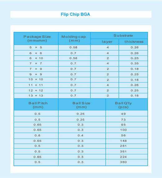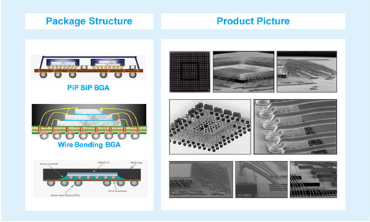 關鍵技術: 高密度、低弧高(40um)、窄間距(50um)打線,Spacer技術,倒裝芯片技術(突塊高度70um/80um/100um),芯片堆疊,密間距植球技術(球徑250um,球間距400um)。