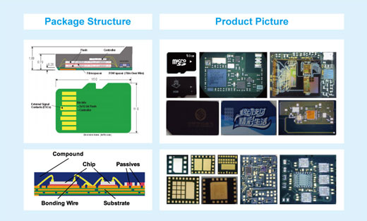 SiP系統集成封裝技術,已成功開發了RF-SIM;Micro SD;USB;FC-BGA;LGA module等一系列產品。